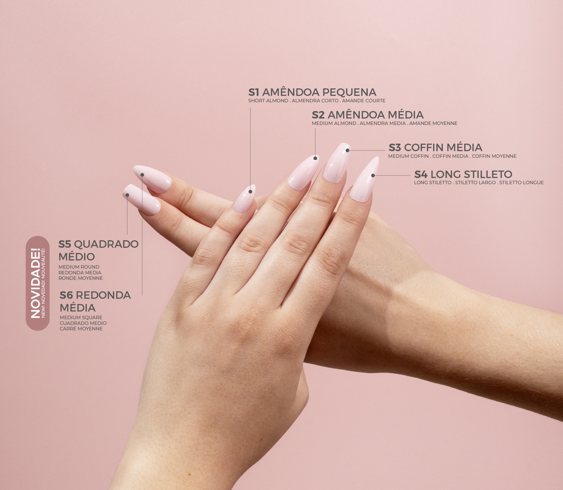 Chegaram as Soft Gel Tips S5 - quadrado médio e S6 - redondo médio! Estes novos formatos de Tips foram desenvolvidos para oferecer maior versatilidade, conforto e desempenho na aplicação sobre a unha natural.