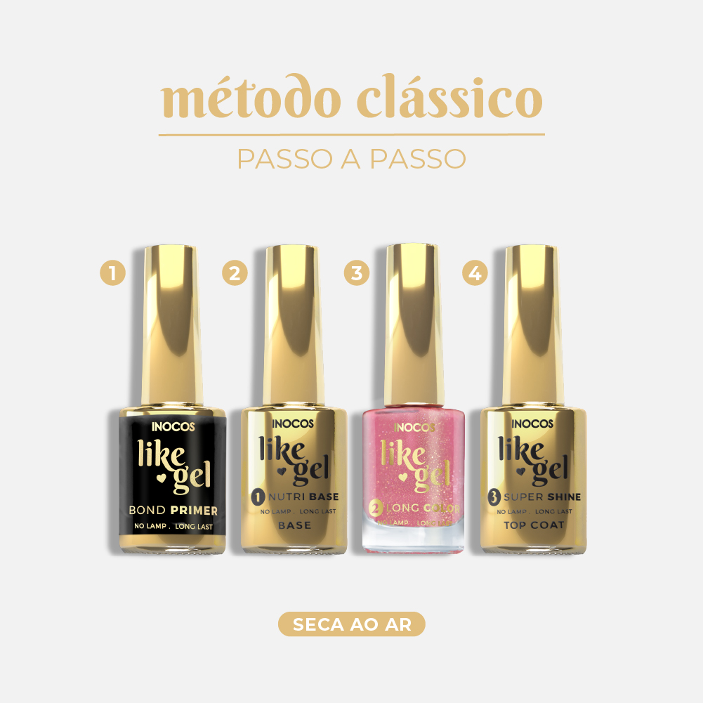 Verniz Efeito Gel de secagem rápida ao ar de longa duração. Utiliza os complementos Like Gel para uma duração até 2 semanas.