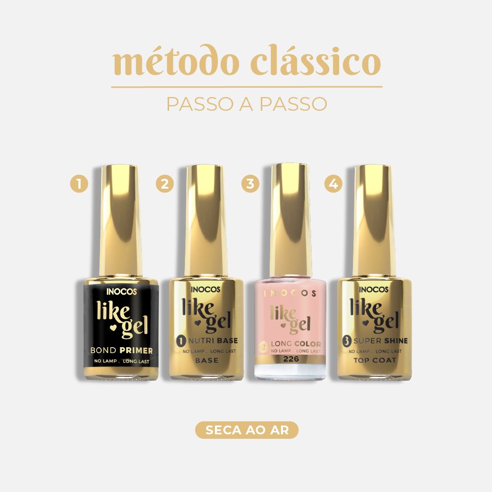 Verniz Efeito Gel de secagem rápida ao ar de longa duração. Utiliza os complementos Like Gel para uma duração até 2 semanas.