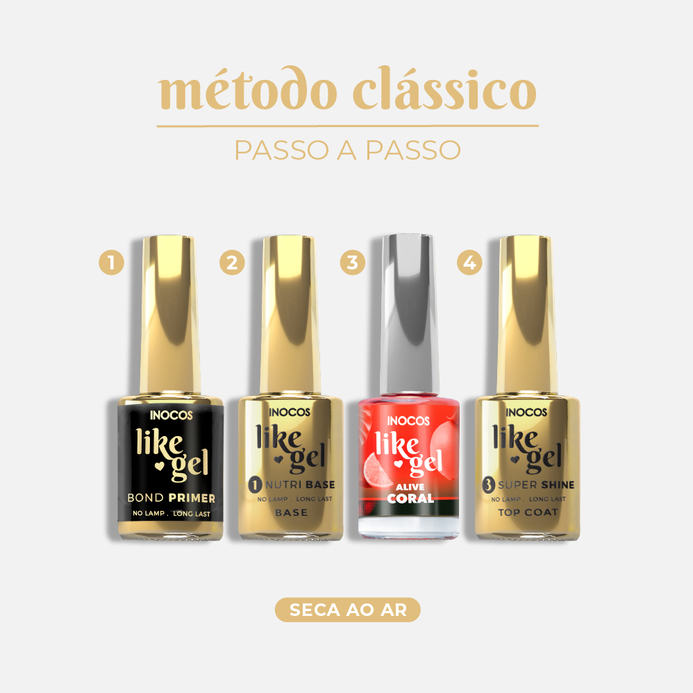 Verniz Efeito Gel de secagem rápida ao ar de longa duração. Utiliza os complementos Like Gel para uma duração até 2 semanas.