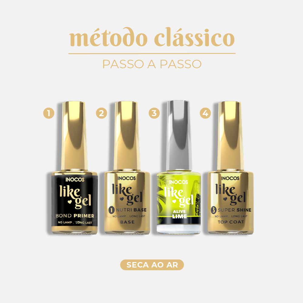 Verniz Efeito Gel de secagem rápida ao ar de longa duração. Utiliza os complementos Like Gel para uma duração até 2 semanas.