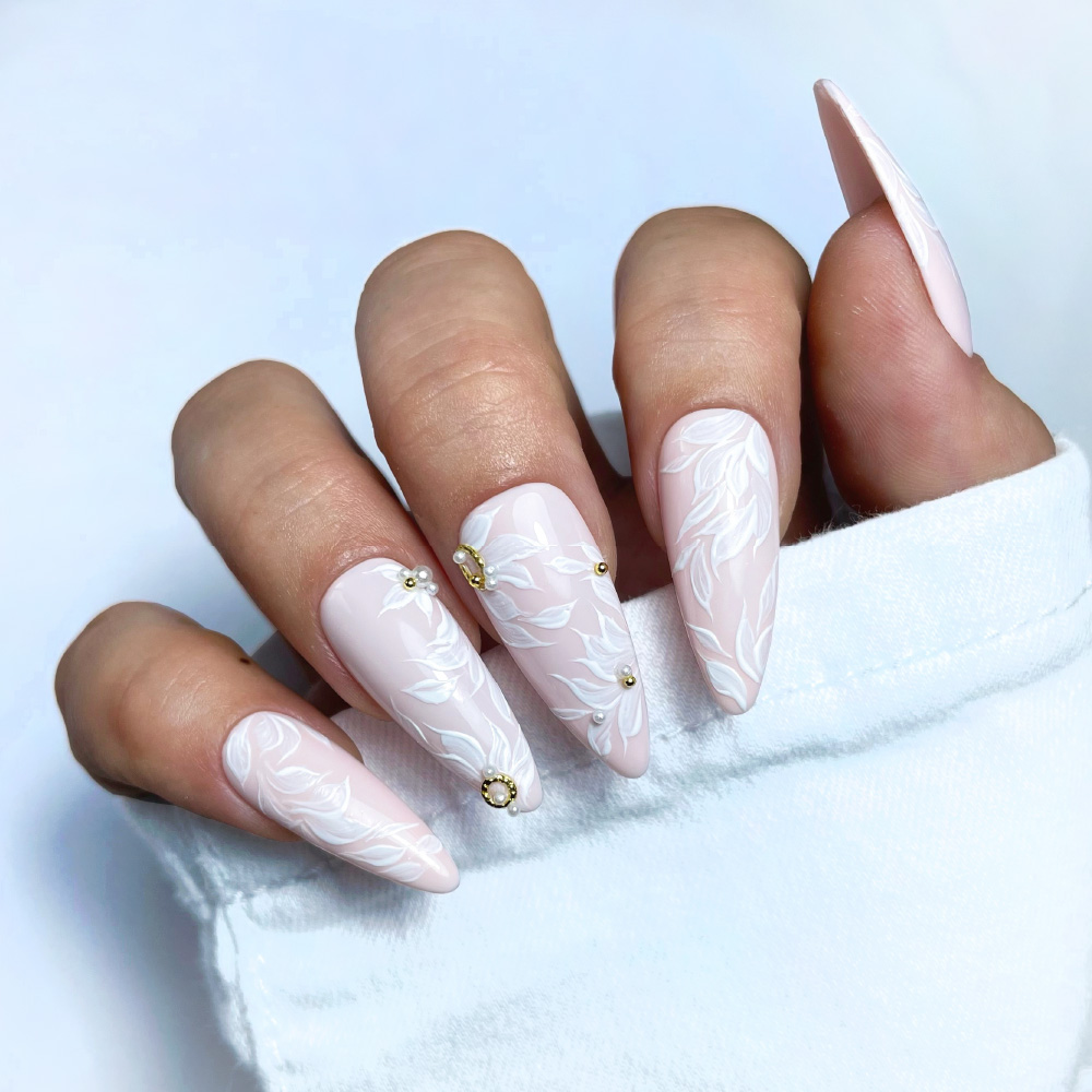 1- Após aplicação da cor, aplicar com a ajuda do Pincel Nail Art 000, uma pequena quantidade de Gel de Construção Transparente na zona onde pretende aplicar a jóia. Não catalisar.